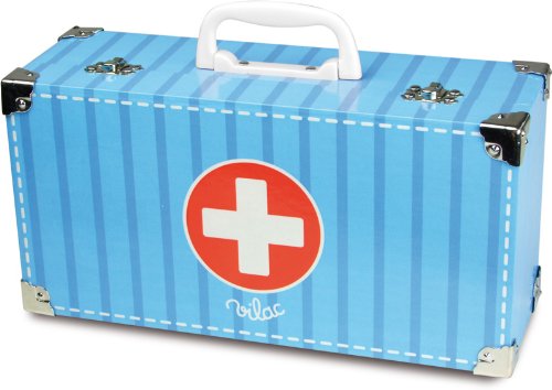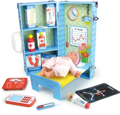 Play doctor with this doctor set in a suitcase that opens up to treat your dolls. The set has 12 pieces including tongue depressors, pretend shot, an X-ray, thermometer, scale, light and chart. Made of wood for children three years and older. French toy company Vilac has been making wooden toys in classic, old world style with contemporary colors and designs since 1911. Vilac toys are unique, never go out of fashion and have lasting appeal for all generations. Vilac nourishes children's imaginative play with animated, joyful characters and reinterpretations of classic toys that will stand up to wear and tear.