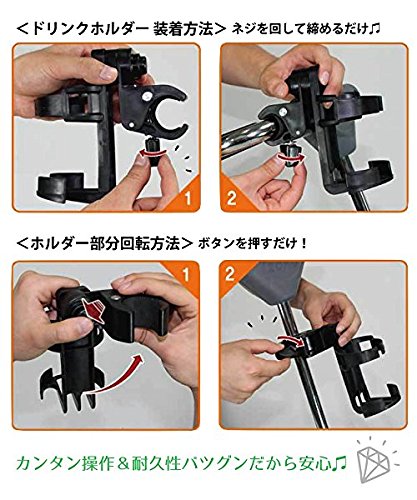 - 【360°回転】ボタンを押すとホルダー部分が360°回転!取り付け部分によって、ドリンクの位置を調整!