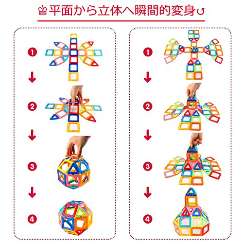 - 【2D・3D立体遊び知育玩具】女の子と男の子を問わず、楽しく遊びできの知育おもちゃであり。S極とN極の極性がなく、360度回転させる事が可能で磁力で互いに付けたり離したりが簡単にできます。小さな手でも扱いやすいサイズ、ピースの組み立てることは手指の発達、目と手の運動を促させることができる上、大きな作品を独立に挑戦することで、バランス感覚の発達、記憶を促すことも可能です。