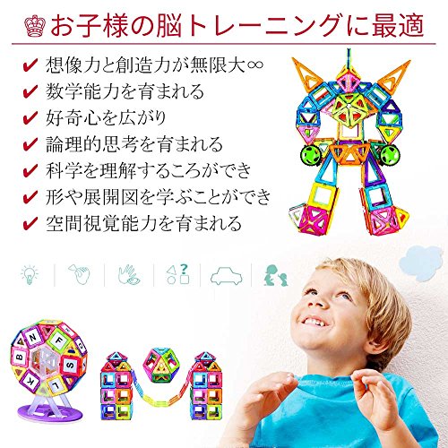- 【高品質、安全性持つ】幼児でも安全に遊びできマグネットブロックであり。赤ちゃんの誤飲を防ぐ大きさ、各辺がアーチ形のデザインで、かすり傷なども避けられます。安全な高品質のABS素材とマグネットで作られでおり、無毒無害で、幼児が舐めても心配ないです。全ての年齢の子供に向いている。超音波処理により真空密封デザイン、永久の磁力片を持って、転んでも破れない。磁石が落ちにくくて、形も安定化する最適な子供おもちゃ、知育おもちゃ マグネット ブロックです。