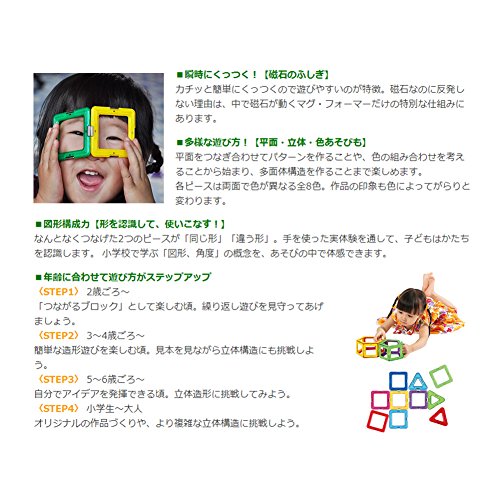 - 【子供プレゼント&学習教具として最高】磁石ブロックは子供の教育・知育玩具として最適しています、色もカラフルで、子供は遊びながら、贈り物、出産祝い、子どもへのお誕生日、入園祝いなどのプレゼントにピッタリ。更に、新居お祝いも勧めです、好きな形を組み立て終わったら、室内装飾を施します。自分の脳中の形を集中して作ってますが、創造性と想像力を鍛えるだけでなく、実践能力と論理的思想を開発できます。児童館・保育園・幼稚園の立体遊び教具としてもオススメです。