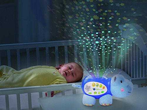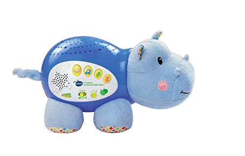 Sweet dreams are ahead with the Lil' Critters Soothing Starlight Hippo by VTech. This cuddly hippo projects a vibrant starry night sky onto the ceiling in four different colors to the sounds of peaceful tunes, seven nursery rhymes, nature sounds and lullabies. Colorful light effects enhance visual awareness, while the comforting sounds and songs help soothe them to sleep. This helpful hippo also responds to your baby's cries with calming music. The parent-friendly volume and timer controls let you choose how loud and long the sounds play. Sleep tight, little one! Requires 2 AA batteries (batteries included for demo purposes only; new batteries recommended for regular use). Intended for babies from birth and up.