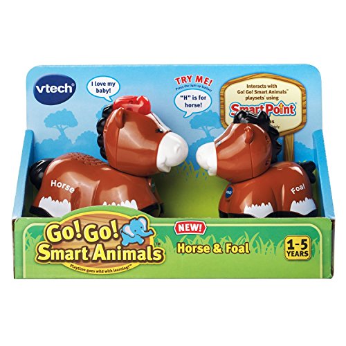 Hanna, the mother horse from the Go! Go! Smart Animals Horse & Foal set by VTech, loves her baby. Press her light-up button to hear three sing-along songs and learn the letter "H" and her animal name as you play. Connect Hanna and her baby together to watch the foal follow the horse. Then, hear nurturing responses when Hanna and her baby kiss! Hanna also responds to SmartPoint locations with different phrases and more on Go! Go! Smart Animals playsets (each sold separately). Also works with Go! Go! Smart Wheels playsets (each sold separately).