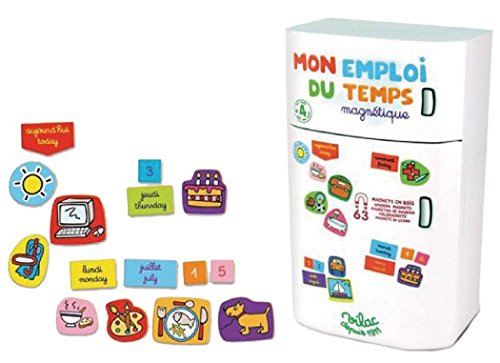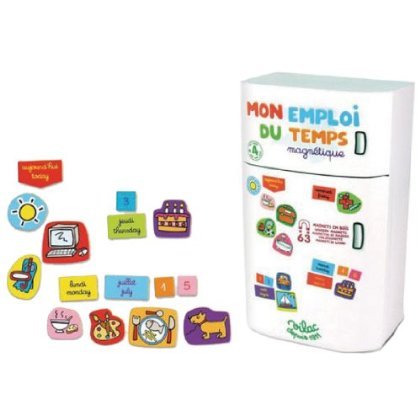 Set of 63 wooden timetable magnets for your refrigerator or magnetic board. Magnets include number, months and pictures of things you do each day. Provides hours of fun for you and your child. Creative storage container looks like a refrigerator. This product is made by the well respected toy makers Vilac who have been making toys for over one hundred years, and display their passion and love of tradition in every item that they sell. Perfectly sized for small hands.