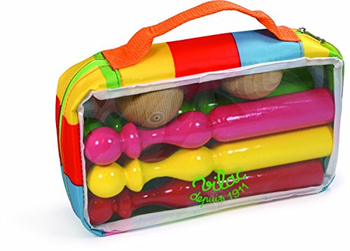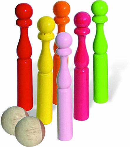 Colored Lacquered Skittles in a set of 6 with two balls made of natural wood with a vibrant lacquer paint finish for indoor or outdoor play. A robust, hard wearing product that can be used all year round by children aged three years and above. Perfect for encouraging coordination and general exercise in a fun and simple way. Elegant and eye catching there is lots of fun to be had. From the Toy Manufacturer Vilac who has been making high quality toys for over a hundred years; whose excellent reputation and passion is apparent in every product that they make. Comes with a colorful and reusable case for storage. Skittles are 8.3" high in size.