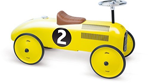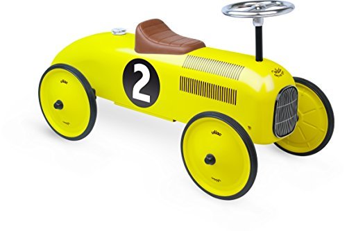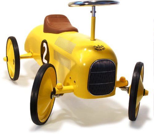 Yellow metal ride-on toy car designed in France. Precisely hand-crafted and hand-painted. Made of heirloom quality to withstand many hours of riding pleasure. Rugged, yet beautiful.