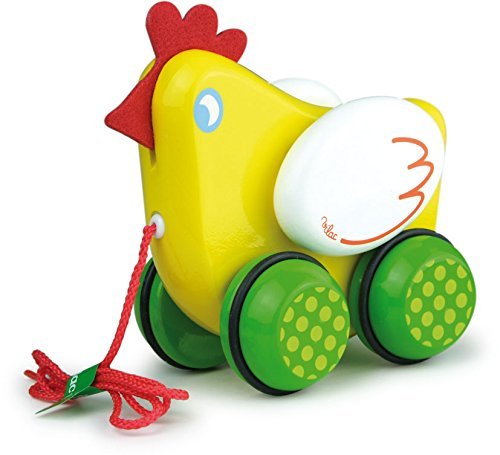 Poupoule the Hen is a wooden pull toy lovingly crafted by Vilac whose toys are adored throughout the world. They are true heirlooms to last generations. Toddlers will have hours of fun playing with the adorable multi colored hen.