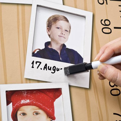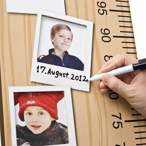 出産・入園・入学祝いの新定番 子供の成長記録を飾れるフォトフレーム付きの身長計。付属の水性マーカーで書き消し自在 W250×H910×D80mm 材質:ファイバーボード、PS 水性マーカー付属