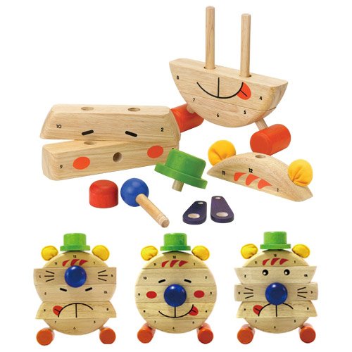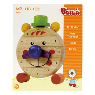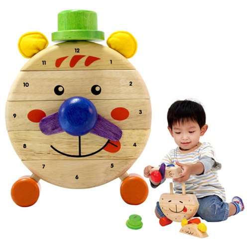 タイの老舗木製玩具メーカーVoila(ボイラ)の楽しく時計の読み方を学べる知育玩具です。 パーツを組み合わせることで色んな表情を作ることができるユニークな時計のおもちゃです。 2種類の髪型、2種類の目、2種類の鼻と口を自由に組み立てて、笑った顔・怒った顔・泣いた顔・・・何パターンもの表情をつくることができます。 緑色の帽子は振ると音が鳴ります。