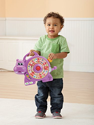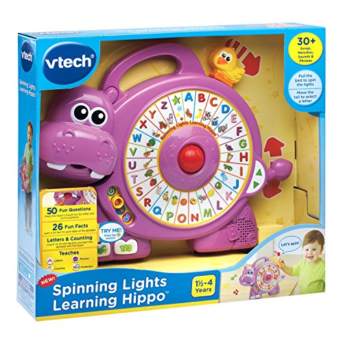 Have a blast with the Spinning Lights Learning Hippo by VTech. This vocabulary builder uses moving lights with six fun activities to encourage language development as well as introduce numbers by making a connection between what they see and what they hear. Your child can spin the lights around the alphabet circle by pulling the bird on the toy hippo's back to learn about letters, phonics, objects, animals and more. They can also move the lights around one at a time by moving the tail up or down. Move the hippo's mouth and he will ask questions to help reinforce learning. Press the ABC button and your preschooler will learn their ABCs as they sing and watch the lights move along to the Alphabet Song. Press the 123 button to see the lights come on to introduce numbers. In music mode, they can move the rolling ball in the center of the musical hippo to add fun sound effects to 26 cheerful melodies. Take a spin with this learning hippo for tons of fun Requires 2 AA batteries (batteries i