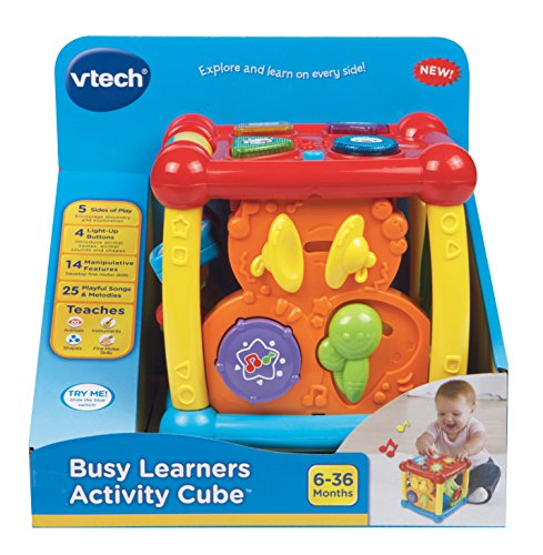 Exploration and fun is around every corner with the Busy Learner’s Activity Cube by VTech. Its five sides to explore, this play cube attracts your baby’s attention and encourages imaginative play with music, light-up buttons, colors and more. Shape and animal buttons introduce animal names, animal sounds and shapes. Press and slide musical instrument buttons introduce instrument names, sounds and colors. Sliding, spinning blocks promote interaction and fine motor skill development. This interactive cube also plays fun sounds when it's moved. Plays 25 sing-along songs and melodies.