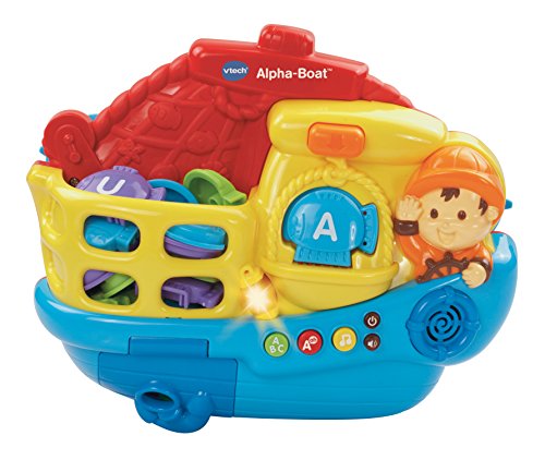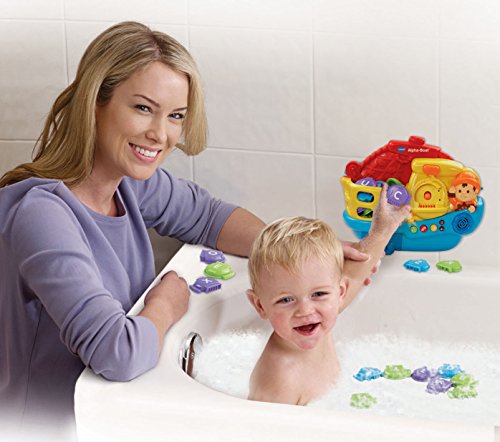 Go on a learning voyage aboard the Alpha-Boat by VTech. Release the fish from the boat’s storage compartment into the tub. Catch the floating fish, and put them on the fisherman’s scale to learn letter names and letter sounds. Your child can then play a simple question and answer game that quizzes them on what they’ve learned. Hear more than 20 cheerful songs and melodies while playing, and watch as the flashing light blinks along to voice and music responses. Includes suction cups for quick and easy mounting to bath tub or tub walls. Set sail on a letter learning adventure.