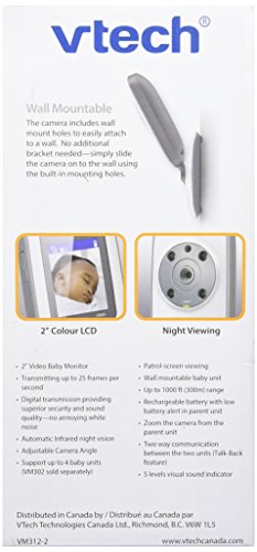 Full motion video with up to 22 frames per second, you can see your child's every move on clear, dynamic video. Sometimes all your baby needs is to hear the sound of your voice. Comfort your infant from any room with the built-in intercom on the portable parent unit. Eight infrared leds automatically detect dim light, providing clear video even in dark rooms the VTech safe and sound full color video and audio baby monitor with 2 cameras - vm312-2 features: * Full motion video, * talk-back intercom, * automatic infrared night vision, * high-resolution 2 inch color lcd, * 1,000 feet of range, VTech, the creator of the electronic learning products (elp) category, is a world leader of age-appropriate learning toys. Since 1976, VTech has been developing high-quality, innovative, educational products for children from birth to preteen that deliver smart play through the combination of entertaining electronic formats and engaging, age-suitable content that help children learn while having fun. VTech believes kids have the power. VTech's innovative toys for baby, infant, toddler, preschool and grade school ages enrich children's development and help them meet their milestones including products such as bugs by reading system and software. VTech is a leader in kid's laptops, learning toys and games. VTech's v. Smile TV learning system is a constant award-winner ensuring your kid will learn through fun and smart play. Find VTech products right here at toys r us .