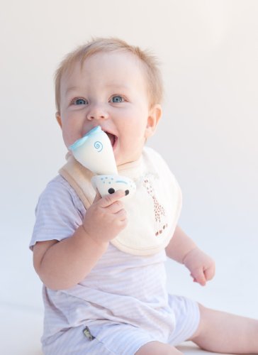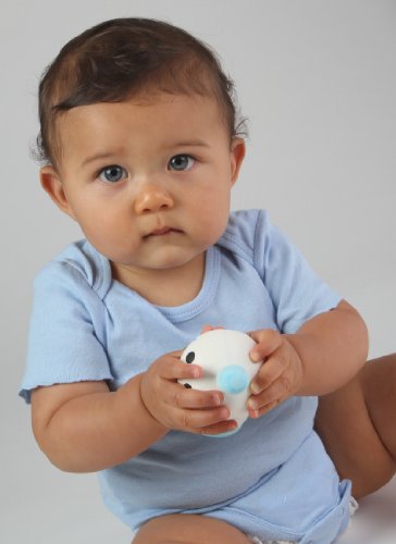 ユニークな形、愛らしい顔と赤ちゃんの持ちやすい形が魅力です。キリンのソフィーと同じく、100%天然ゴム製で、ペイントは食用塗料を使用しています。押すと「キューキュー」という音が鳴る仕掛け付き。