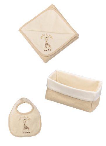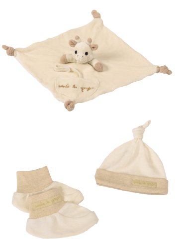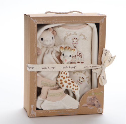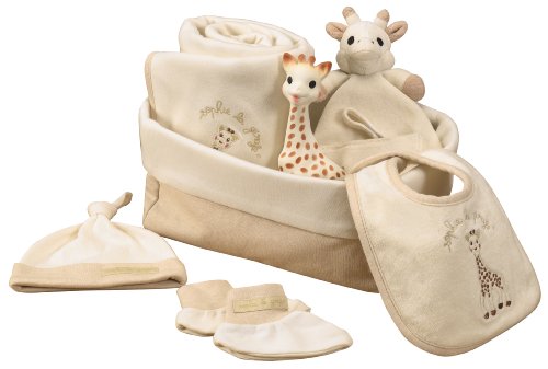 生まれたばかりの赤ちゃんを迎えるのにぴったりの新生児7点セット。 天然ゴムと食用ペイントで作られたソフィー、 生まれたての赤ちゃんを守る帽子、 寒さから守る新生児用靴下、 赤ちゃんを優しく包む大きめのブランケット。100cmX75cm、 いつも一緒にいたくなるセキュリティーブランケット、 最初の一口のためのビブ、 全部一緒に入れることができるバスケット。