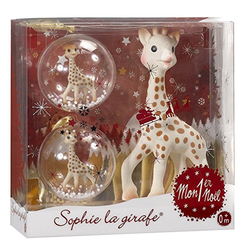 キリンのソフィー(歯固め)と2つの透明なクリスマスボールのギフトセットです。