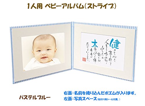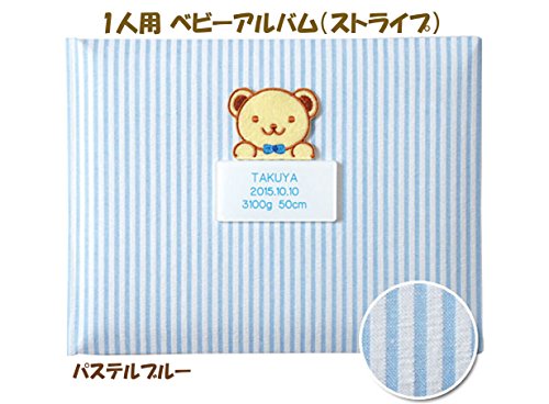 出産記念 赤ちゃん 人気 メモリアルグッズ 【 1人用ベビーアルバム (ストライプ) 】 ネームインポエム 出生記録プレート付き (パステルブルー)