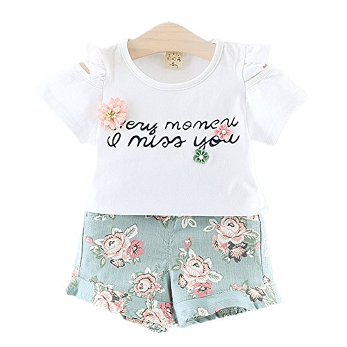 WIN 夏ベイビー服 女の子Tシャツ キッズ用かわいい花 パンツ2点セット 子供ギフト 綿 通気 春夏 誕生日 結婚式 入学式 子供の日 遊園地に (100cm, ホワイト+グリーンパンツ)