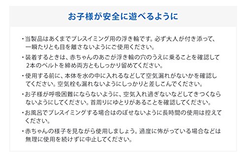 ・当製品はあくまでプレスイミング用の浮き輪です。必ず大人が付き添って、一瞬たりとも目を離さないようにご使用ください。 ・装着するときは、赤ちゃんのあごが浮き輪の穴のうえに乗ることを確認して2本のベルトを締め両方ともしっかり留めてください。 ・使用する前に、本体を水の中に入れるなどして空気漏れがないかを確認してください。空気栓も漏れないようにしっかりと差しこんでください。 ・お子様が呼吸困難にならないように、空気入れ過ぎないなどしてきつくならないようにしてください。首周りにゆとりがあることを確認してください。 ・お風呂でプレスイミングする場合はのぼせないように長時間の使用は控えてください。 ・赤ちゃんの様子を見ながら使用しましょう。過度に怖がっている場合などは無理に使用を続けずに中止してください。