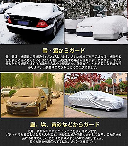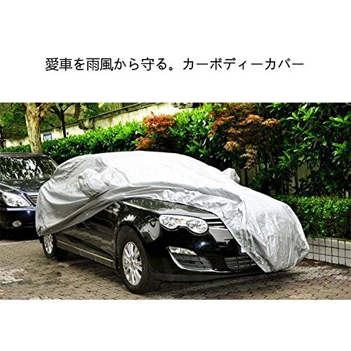 サイズに対応 • Sサイズ:L*W*H=4.15*1.7*1.5m • Mサイズ:L*W*H=4.5*1.75*1.5m • Lサイズ:L*W*H=4.7*1.8*1.5m • XLサイズ:L*W*H=4.9*1.8*1.5m • XXLサイズ:L*W*H=5.3*2.0*1.5m セット内容: 1 X カーボディカバー 1 X 収納袋