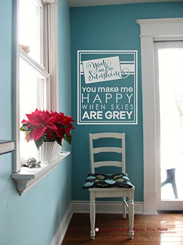 You Are My Sunshine You Make Me Happy When Skies Are Grey - Wall Sticker Quote - This wall sticker quote is great in a master bedroom, kids room or even a bathroom! This Wall Vinyl Sticker is safe for Home Decor use, is easily removable without harming your wall surface but is not reusable. The matte finish makes it look like it is painted on! Detailed application instructions included. Our Wall Stickers are die-cut decals - they are NOT a printed design on a clear plastic piece. They can be applied to any smooth or semi-smooth surface. A squeegee is a handy tool to have for application. Exclusive of Wall Decor Plus More and Made in the USA.