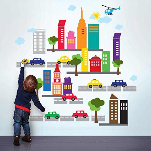 Beep beep. Add instant energy to your nursery, playroom, or classroom walls with a booming peel- and-stick city. What's Included: Each kit includes buildings ranging in size from 6' high to 16' high, 75' of road pieces, 7 clouds, 1 sun, 1 4' x 7' helicopter, 7 autos (approx: 6'w x 3'h), and 5 trees ranging in size from 4'w x 7'h to 6'w x 10'h.