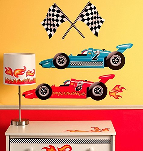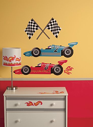 Create your own design. Your child will love decorating the race cars in Wallies Grand Prix Racing Wall Play. Each package comes with 2 cars 261/2" x 83/4", 12 assorted flames 3" x 33/4" to 1⅞" x 9⅞", 11 numbers 1⅞" x 2⅞" to 21/2" x 2⅞", 4 hub caps 3⅛" x 3⅛" to 3⅜" x 3⅜", 8 banners 9 ⅜" x 8⅛", 2 flags 13⅜" x 8⅛"". Every Wallies Peel & Stick design is made of durable, self-adhesive backed vinyl that can be removed and repositioned easily. To use, simply peel the pieces off of the backing in the package and apply to any clean, smooth surface or painted dry wall. Wallies will not harm or damage surfaces and will not leave a sticky residue.