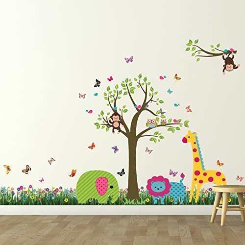 Walplus Removable Wall Stickers British Colourful Grass + Animal Tree, Nursery Kid's Room, 188Cm X 156Cm, Multi - Colour [並行輸入品]