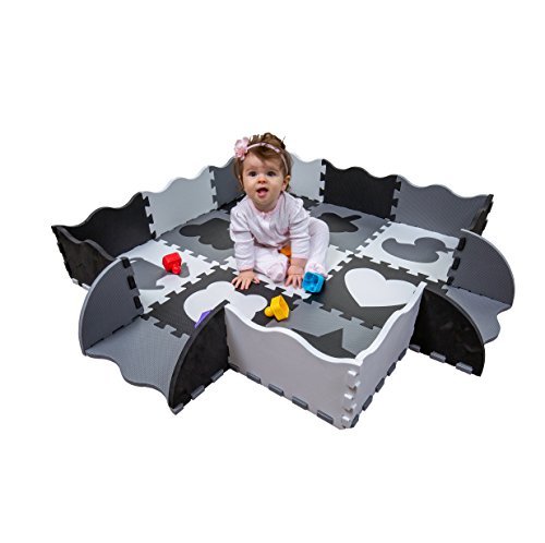 SAFE AND NON-TOXIC. Meets CPSIA standards and has been 3rd party tested in the United States to be FREE of BPA, Phthalates, Lead, Formamide and Latex;NO SMALL PIECES. We have designed these mats specifically to be safe for all ages. No small puzzle pieces are present for your child to choke on;EXTRA THICK pieces of 9/16 for that extra protection from bumps and toddler falls;SIMPLE VERSATILE DESIGN allows you to lay it flat for larger area or put borders up for fenced in area. Can make doorways for your child to imagine all sorts of playhouses. INCLUDES zippered carrying case for easy storage.;ENCOURAGE DEVELOPMENT of fine and gross motor skills, hand eye coordination, reasoning and visual sensory development