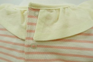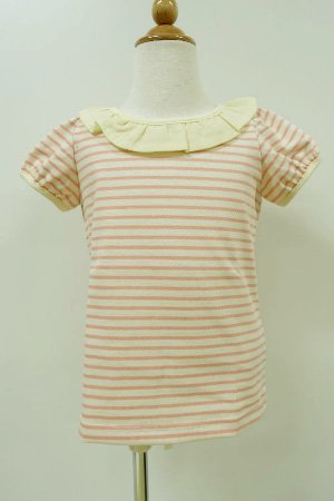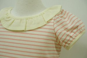 日本製フリル付きボーダーTシャツ。☆ピンクのボーダーに襟元のフリルがガーリー度アップです。☆お気に入りのスカートやかぼちゃパンツとコーデしてね♪☆<品質> 綿100%