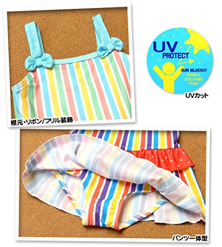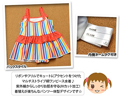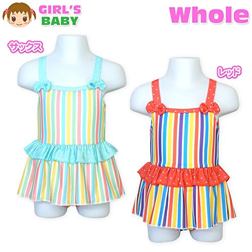 (サックス/80cm)ベビー 水着 スイムウエア Whole ホール 女の子 ワンピース UVカット マルチストライプ リボン フリル ネームタグ付 女児 ベビー