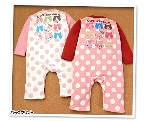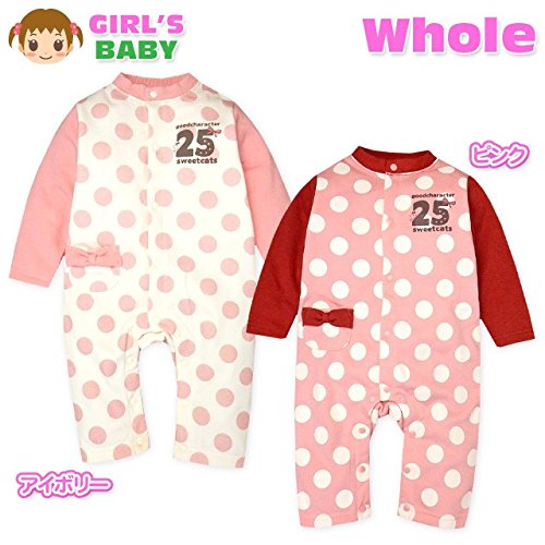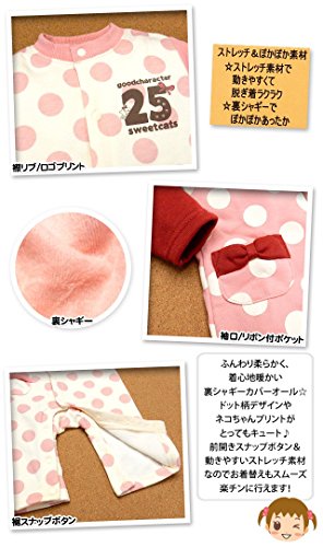 (ピンク/80cm)ベビー服 女の子 カバーオール Whole ホール 長袖 裏シャギー ストレッチ ドット柄 ネコプリント リボン ポケット付 前開き スナップボタン 女児 ベビー