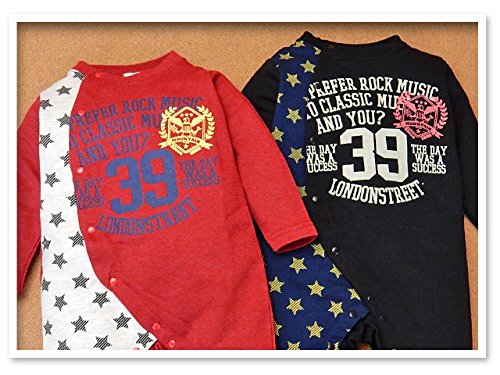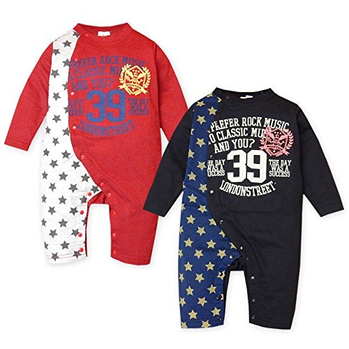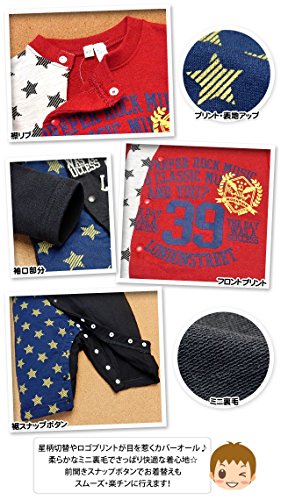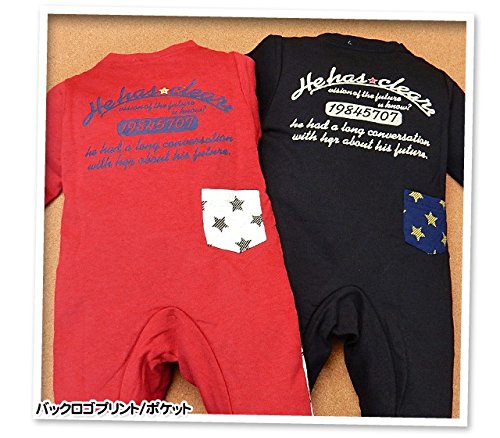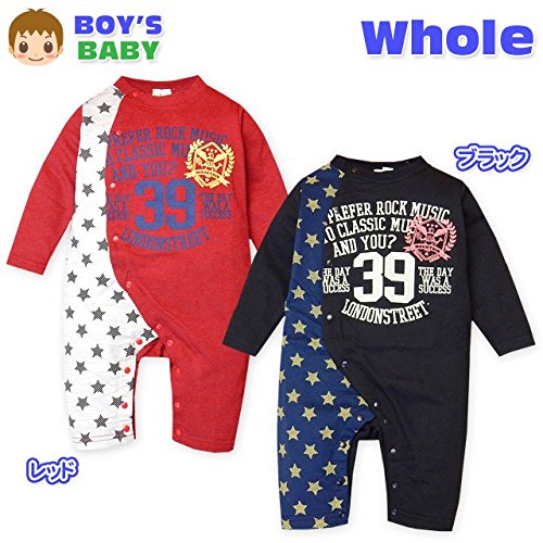 (ブラック/80cm)ベビー服 男の子 カバーオール Whole ホール 長袖 ミニ裏毛 星柄 エンブレム ロゴプリント ポケット付 前開き スナップボタン 男児 ベビー