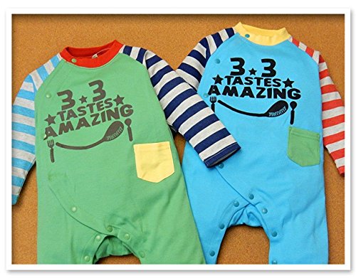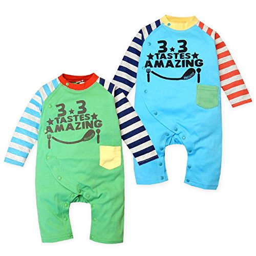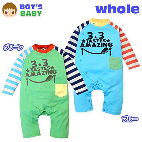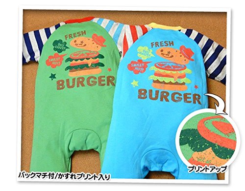 (グリーン/70cm)ベビー服 男の子 カバーオール 長袖 ボーダー 配色切替 ハンバーガー ロゴプリント 前開き スナップボタン 男児 ベビー