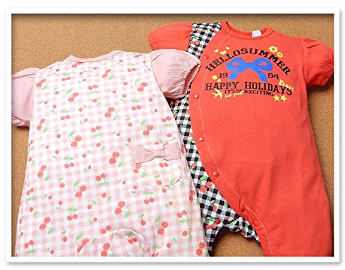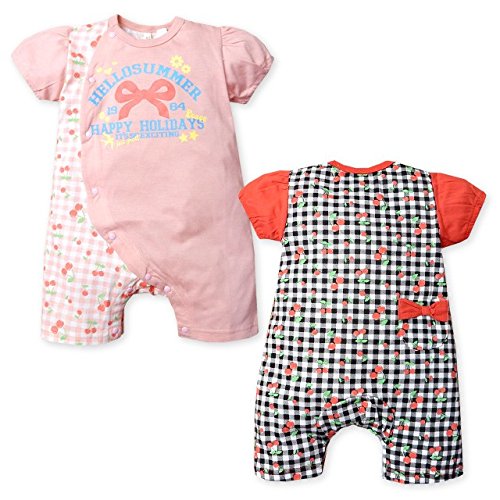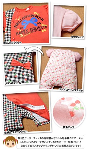 (レッド/80cm)ベビー服 女の子 ロンパース カバーオール 半袖 ギンガムチェック切替 サクランボ柄 リボン装飾 パフスリーブ 前開き スナップボタン 女児 ベビー