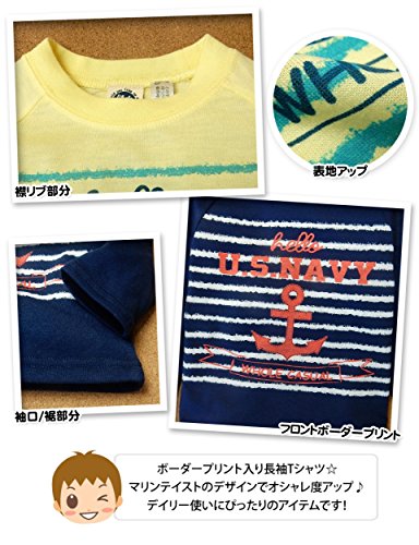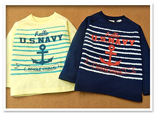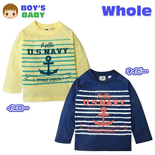 (ネイビー/95cm)ベビー服 男の子 Tシャツ Whole ホール 長袖 フロントプリント ボーダー柄 イカリプリント 男児 ベビー