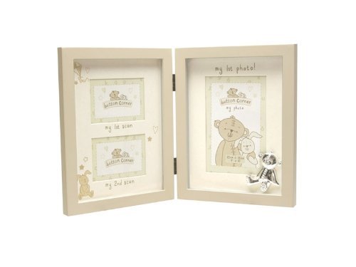 ??utton Corner MDF Triple Photo Frame.;??paces For 1st Scan Picture, 2nd Scan Picture & 1st Photo;??easures H:22 x W:38 x D:2 cm;Perfect Gift For A Baby Shower, New Baby Gift, or Christening Gift