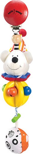 熊の顔部分は音が鳴り、下のカラフルな4色の木の玉は固定されていないので、ひっぱって遊ぶことができる。