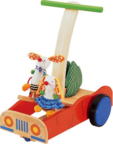 タイの木製玩具メーカー、Wonderworld(ワンダーワールド)社の手押し車。ハンドル部分を持って押すことで前部の2匹のうさぎが上下に動き、カタカタと音をたててすすむおもちゃ。 ヨーロッパの安全基準を満たし、環境にやさしいゴムの木で作られている。