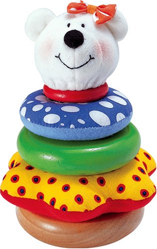 かわいい熊の頭を頂点にして、木製リングと布製リングが交互に重ねられている。鮮やかな色合いも特長。