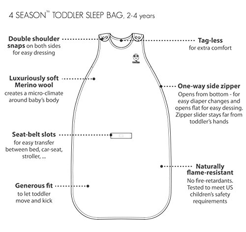 スリープバッグを使うときの重さや赤ちゃんが眠っているときに暑すぎないか寒すぎないか、心配ですか? Woolinoなら、心配ご無用です。非常に通気性のいいメリノウールを使用しているので、自然に赤ちゃんの体温を適度に保ち、安全かつ快適な状態で一晩中眠れます。 この上質な赤ちゃん用のスリーピングバッグがあれば、色々なサイズやTOGレートのものをたくさん購入する必要がなく、2-4歳までの赤ちゃんにワンサイズでフィットし、一年中使用できます。 100% 自然素材: シルクのように柔らかなオーストラリア製メリノウール裏地&GOTS認証オーガニックコットンの表地。 大きめに107cm(42インチ)の長さがあり、2-4歳のお子様にフィットします。 全シーズン、お部屋の温度に適しています。17-25℃ 他の繊維素材とは異なり、メリノは寒い時でも暑い時でも赤ちゃんの体温を適温に温かく保ちます。 両肩にスナップボタンがあり、着脱が簡単です。全身にサイドファスナーがあります。 ファスナーガードはお子様の肌を守り、ファスナーのつまみを噛んでしまうのを防ぎます。 洗濯機で洗濯可。乾燥機使用可。 着用ガイドと幼児用体温計付き 人体に無害な100%生分解性のギフトボックスにきれいに入れられています。 米国消費者製品安全委員会(CPSC)の子供用製品の安全性を満たしています。 ウールマークに認証を受けたメリノ。エコテックス規格100の認証を受けた繊維素材&付属品(人体に有害な物質の検査済) 自然な耐火性があり、危険な化学物質は不使用です。 メリノを選ぶ理由 医学的な研究により、メリノウールを着て眠ると、赤ちゃんはすぐに落ち着き、目を覚ましたり泣いたりせず、眠る時間が長くなり早く体重が増えるということがわかっています。他のウールよりも非常に繊維が細く、メリノはお子様の繊細な肌に適した繊維です。通気性が良く、体温を適温に保ち、湿気を制御します。低アレルギー性でケアがしやすく耐久性も抜群です。パーフェクトな製品です。