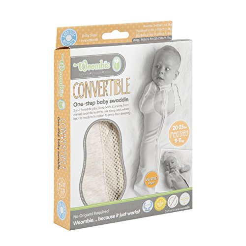 VENTED CONVERTIBLE SWADDLE - Swaddling has been proven to help babies sleep better, longer, and safer. Appreciated by moms and little ones alike, our vented convertible swaddle adds an arms free option to the original award-winning peanut shape, allowing you to use whichever option is more comfortable for your baby! Designed for mega-sized babies between 20-25 pounds.;STRETCHY BUT SNUG BABY FIT - The Woombie Convertible Baby Swaddle allows comfortable natural arm and leg movement during sleep and can convert into a single leg onesie with an open-arm option. With multi-dimensional stretch fabric, the Woombie snuggles and moves with the baby, recreating a womb-like environment and simulating the feeling of being held, touched, and cuddled.;LIGHTWEIGHT AND BREATHABLE - Our swaddle has a seamless interior for maximum comfort and features a 2-way zipper that allows for quick diaper changes at night. It also includes a vent to allow for swaddling in warmer environments without the risk of overheating.;DESIGNED BY CERTIFIED SPECIALISTS - Designed by a certified infant care specialist and nursing team, our swaddles don't unravel like blankets, which can potentially block airways. Our swaddles are safe, encourage back sleeping, and promote self-soothing by allowing babies to hold and touch the inside of the garment.;PRODUCT SPECIFICATIONS - Package includes (1) Woombie Convertible Baby Swaddle with Vent - Freebird (Heathered Cream) - Mega Baby 20-25 lbs. Woombie Sizes: Preemie: 16-17 inches, 3-6 lbs. Newborn: 20-22 inches, 5-13 lbs. Big Baby: 24-26 inches, 14-19 lbs. Mega: 27-29 inches, 20-25 lbs.