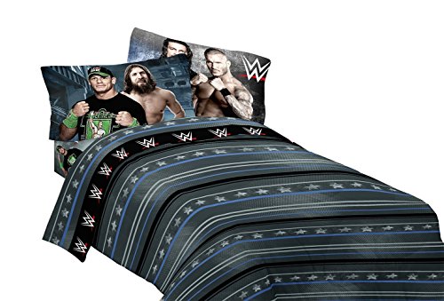 Size:Full WWE Industrial Strength full sheet set flat sheet is gray striped, fitted sheet features the WWE wrestlers on a light gray ground and two pillowcases that reverse for 2 different looks. Made of 60% cotton/40% polyester.