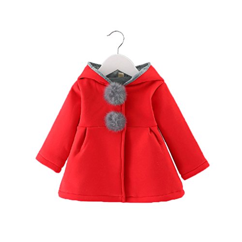 X-LAN キッズ コート 女の子 コート アウター ジャケット 子供服 ウサギの耳 ポンポン付き フード付き ベビー服 長袖 厚手 防寒 秋冬 キュート ファッション 旅行 保育園 グレー ピンク レッド (90CM, レッド)