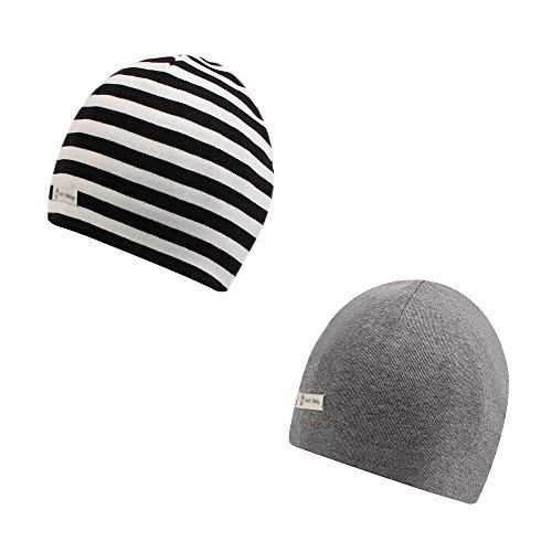 XIAOHAWANG新生児ベビー 帽子 冬 秋 春 男の子 女の子 ニット ローガニックコットン 無地 やわらかい 肌さわりよく 防寒 防風 オールシーズン 出産祝い 2点セット(7ヶ月-3歳(頭囲45-50cm), ブラックのしま+ダークグレー)