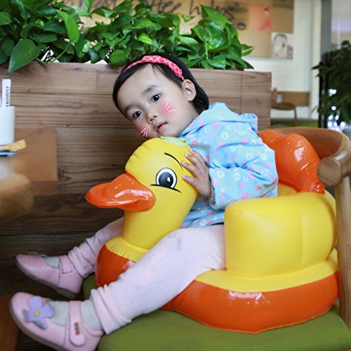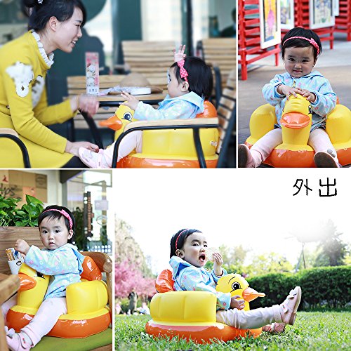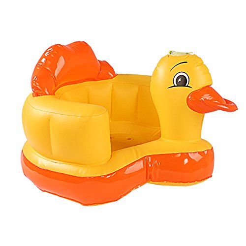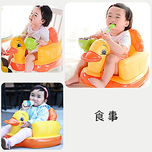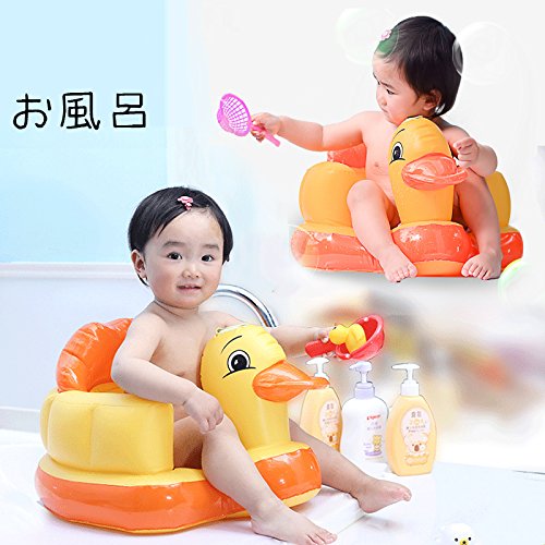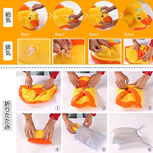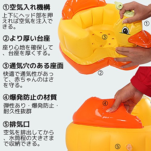 - 空気入れ不要。上下にアヒルのヘッドを押して空気を注入でき、外出の場合はとても便利。水筒程の大きさまで収納して、カバンに入れられる。座面に通気/排水用穴があって、赤ちゃんが蒸れを感じない。