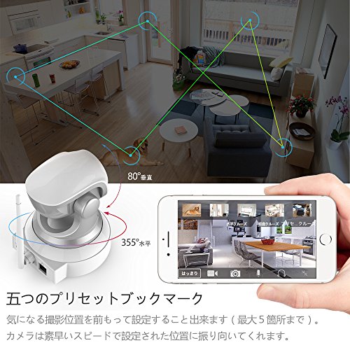 - ♟【プリセット】気になる撮影位置を前もって設定すること出来ます(最大5箇所まで設定可能)。アプリ内に位置変換操作するだけて、カメラが素早いスピードで振り向いてくれます。