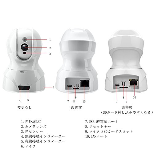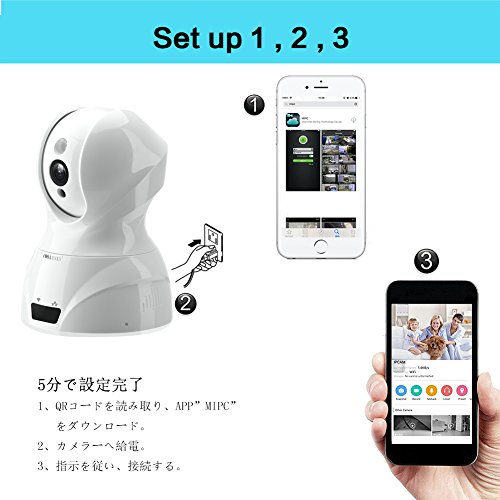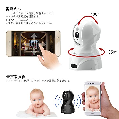 - 音声双方向、動体感知警報: スピーカーとマイクが搭載され、赤ちゃんと話せる。そして、赤ちゃんの動きを検知すると、自動的に録画し、携帯へ通知する。ベビーモニター、介護カメラとしても無論、防犯カメラとしても適切。(マイクを使用するとき、「話を押して、」ボタンを押しながら話ください。)