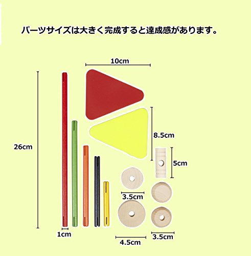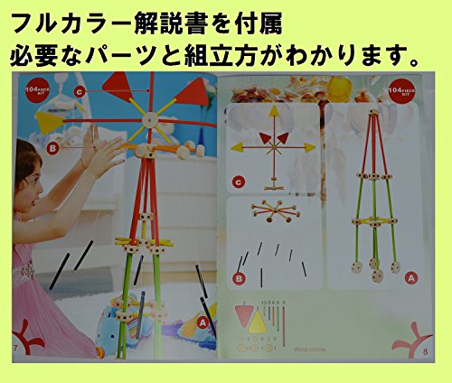 - 組み立て例:ウインドウチャイム、飛行機、宇宙ステーション、ブランコ、風車、鳥、ヨット、ゴーカート、ヘリコプターなど他にもたくさん作ることができます。