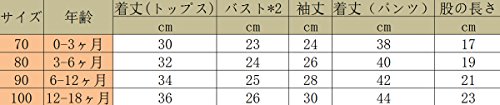 80cm(3-6ヶ月):着丈(トップス)32 cm、バスト*2 24cm、袖丈 26cm、着丈(パンツ)40cm、股の長さ 19cm